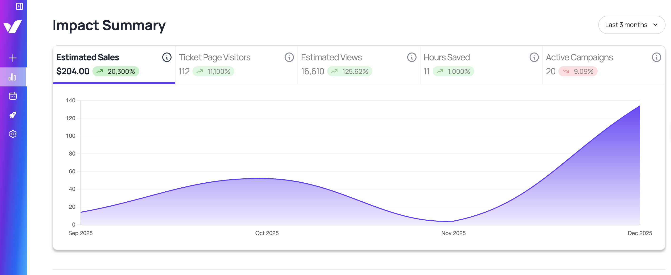 However based on data from real customers like Big Laugh Comedy (over $90,000 in tickets sold), Yuengling Drafthouse (over 20% lift in Food & Beverage Sales) and many others, we've been able to build estimates of how many people convert to buying tickets and display that in your dashboard as the estimated ticket sales and calculate an ROI based on that information.