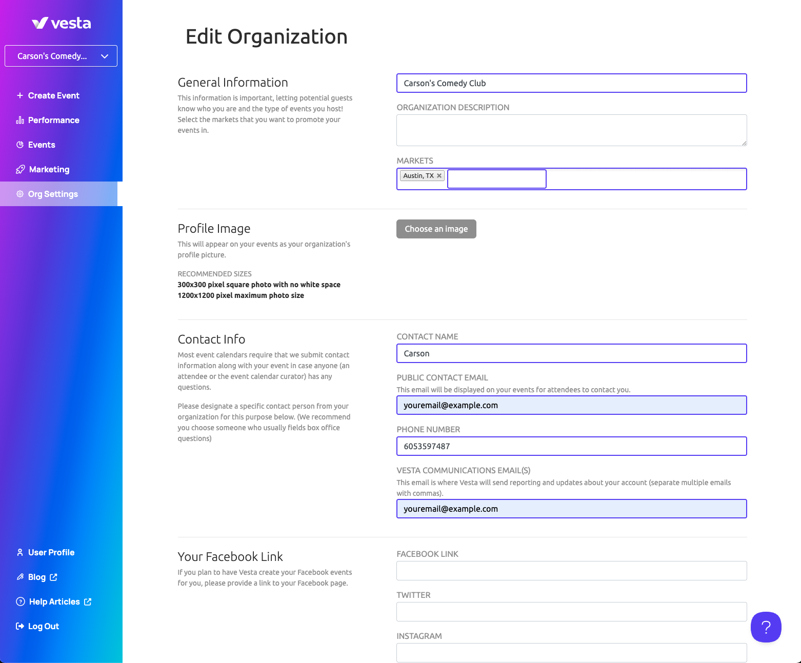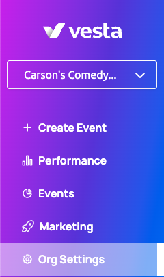 - To start, log into eventvesta.com/dashboard and click into the Org Settings page.