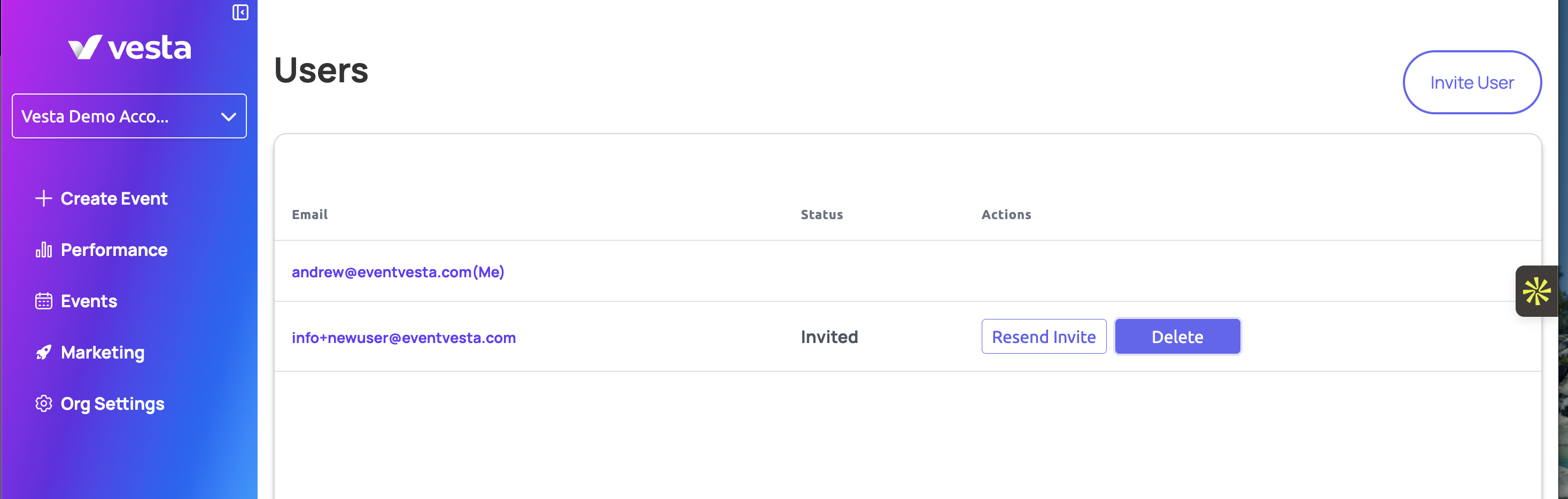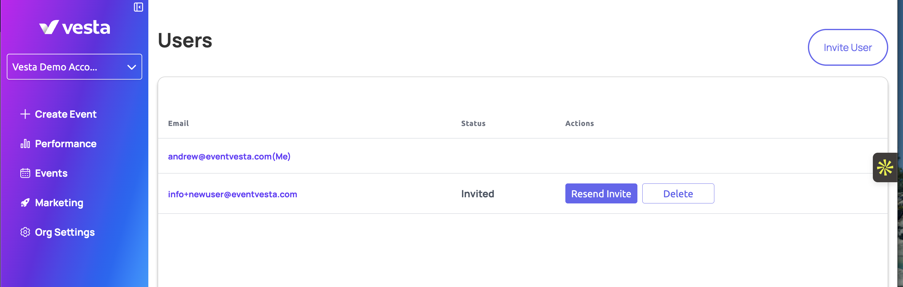 - Then for the user you're trying to get invited, click "resend invite" to re-invite them to your Vesta organization!